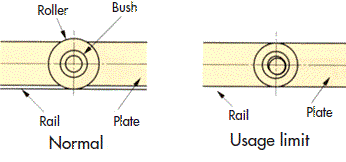 • 板之間的摩擦以及滾子側面與板內側的接觸會產生磨損,如下圖 (左) 中的 (A) (B) 所示。這個磨損量超過板厚的1/3的話就是極限。
