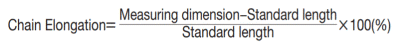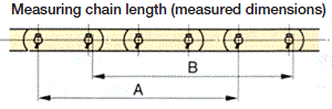 此使用限制為基準長度 (節距X鏈節數) 的2%。測量盡可能多的鏈節 (至少4個鏈節),如下所示。測量位置請用下述A、B中的任意一種方法測量鏈條的長度,與基準長度對比後,求出鏈條的伸長率 (%) 。