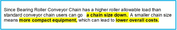 由於它包含圓筒滾柱(軸承),與採用普通滑動軸承的通用輸送鏈相比,潤滑時間可延長 5 到 10 倍,從而減少所需的維護量。