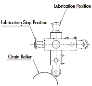 格子臂的前端滾子如果連續運轉,磨損損傷會明顯加快。加完所需量的油後,請用油箱的旋塞停止加油,如右圖所示,不要讓棋盤臂與鏈條接觸。