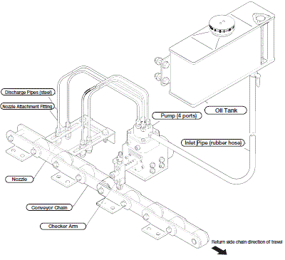 如果安裝在傾斜部分,可能會發生出油不良。請將輸送鏈用加油機的主體安裝在水平部。