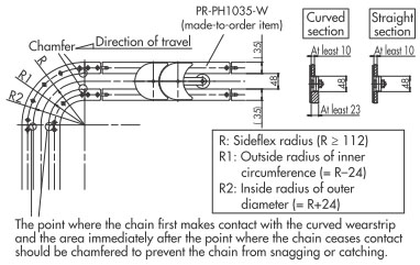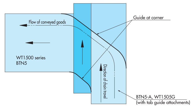 透過使用我們的壓尺條和 GTO/TOD 型鏈條,無需使用通常所需的死板,即可實現搬運物中平穩的 90° 角度變化。