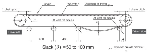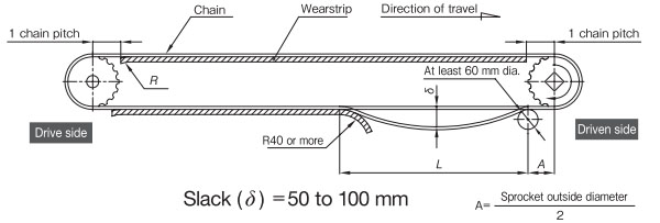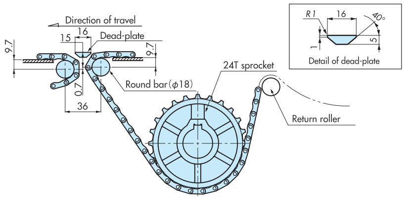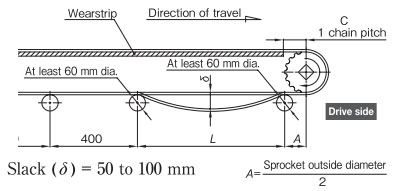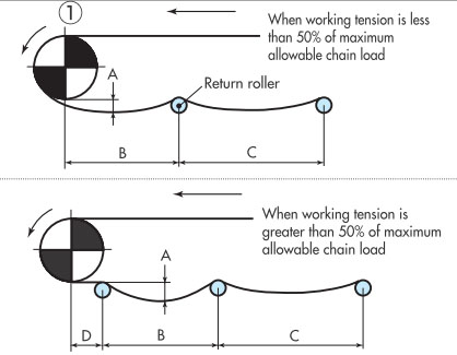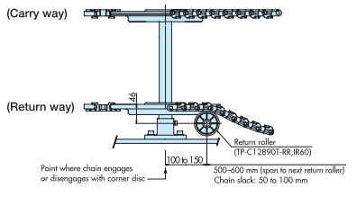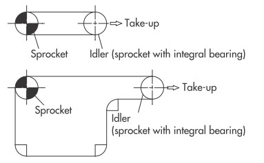 作為最普通的佈局,返回輥接收的方法是推薦的。在回位滾子的固定方式中,可以設置適當的鏈條松弛部分,可以吸收鏈條伸長,因此推薦使用。如果帶有翼板,則需要防止翼板與滾子發生幹涉。