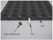將具備鏈條結構的塑料制模塊連桿組合成磚狀,通過帶狀的寬輸送面和鏈條與鏈輪的嚙合實現可靠驅動。