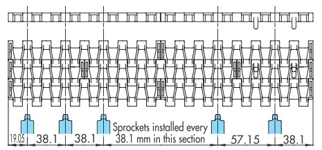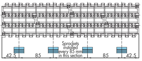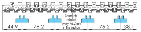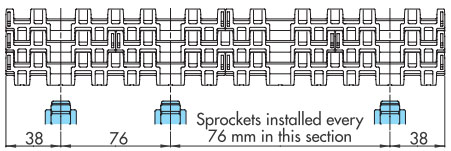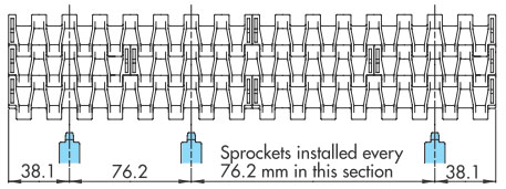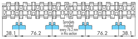 鏈節距(9.525 至 25.4 mm)比塑膠頂板鏈條的節距小,因此鏈輪的外徑可以更小。