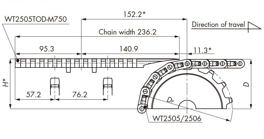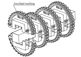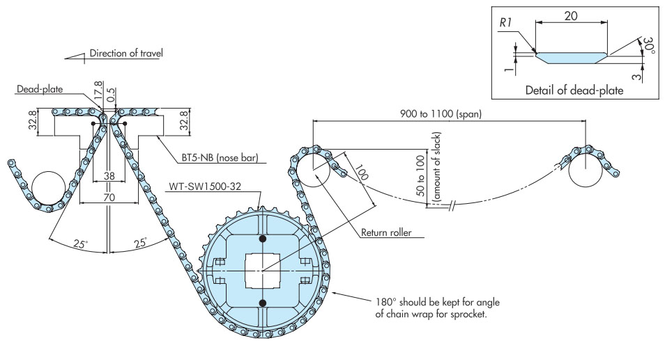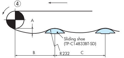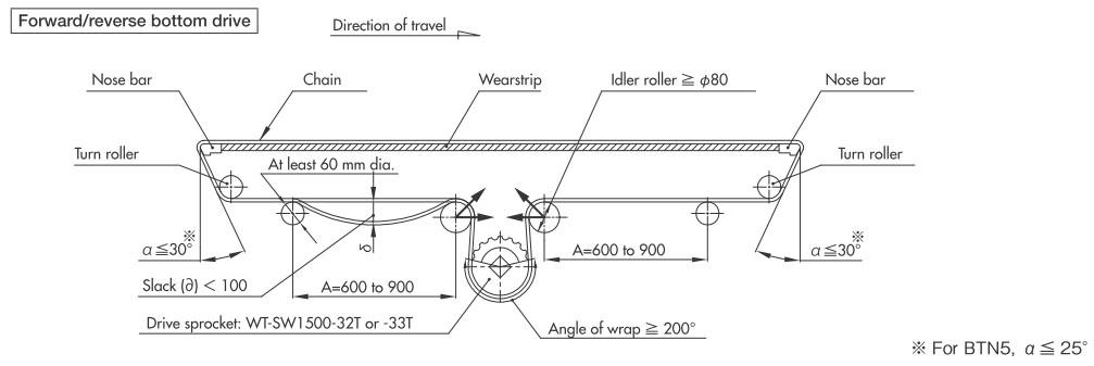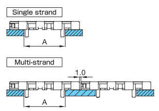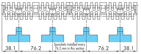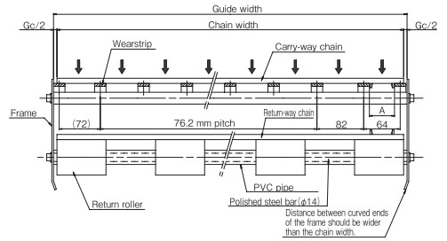 導軌應與鏈輪交替等間距放置。關於導軌間隔A, BTN為76mm, BT6、BT8、WT1500、WT3005、BTC8S為76.2mm, WT2500為76.2mm (導軌寬度25mm),WT3086、WT2250為85mm, WT3816為100mm (導軌寬度30mm) 。
