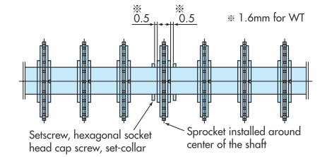 正反底部驅動時,約1.5倍使用張力的負荷會作用於惰輪輥部,因此使用機械寬度較大的輸送機 (1m以上) 時,請選擇剛性足夠的軸,或採用3個點以上支撐的方式承受軸。