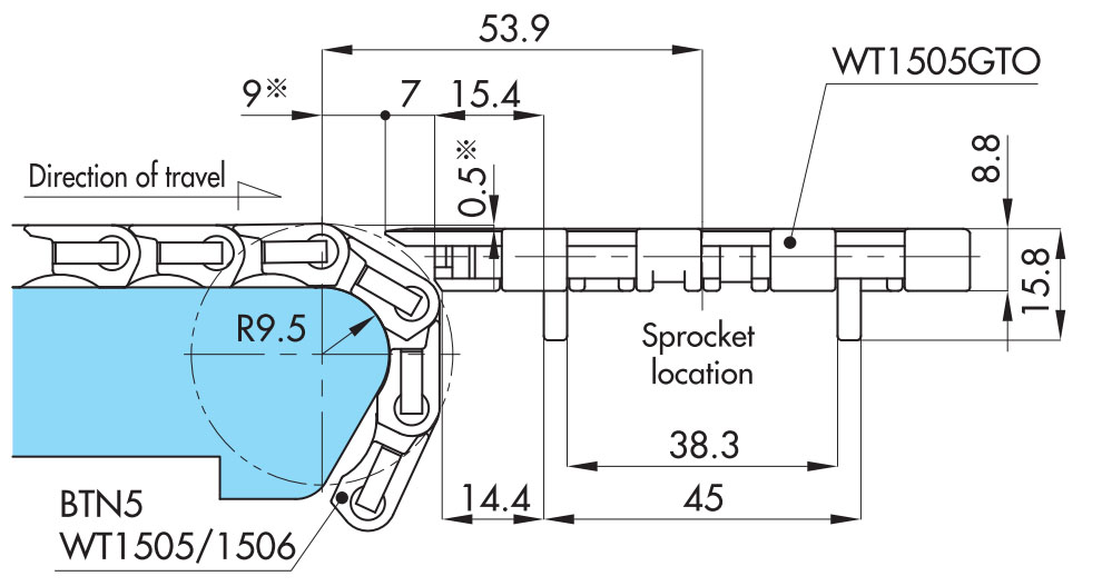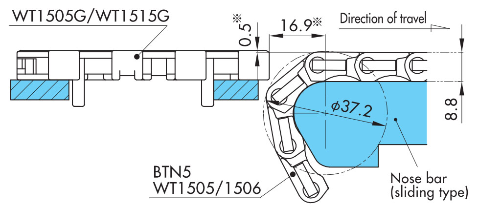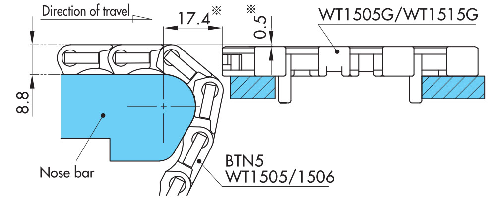透過使用 WT1500 系列或 BTN5,可以在輸送機之間進行直線對接連接。對接該部分使用的死板最多可縮窄 20 mm。