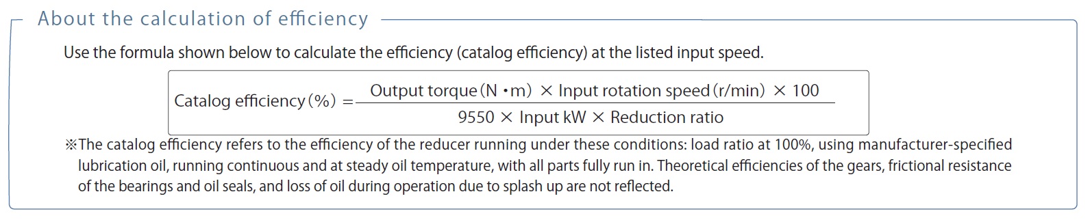 蝸輪減速機的效率取決於減速比和輸入軸(馬達)的轉速。 例如,當 EW100T10R(尺寸 100,減速比 1/10)以 1,750 r/min轉速輸入時,運轉效率超過 90%;而當以 100 r/min轉速輸入時,運轉效率約為 80%。 這些數據可以根據產品目錄中的傳動能力表計算。 |