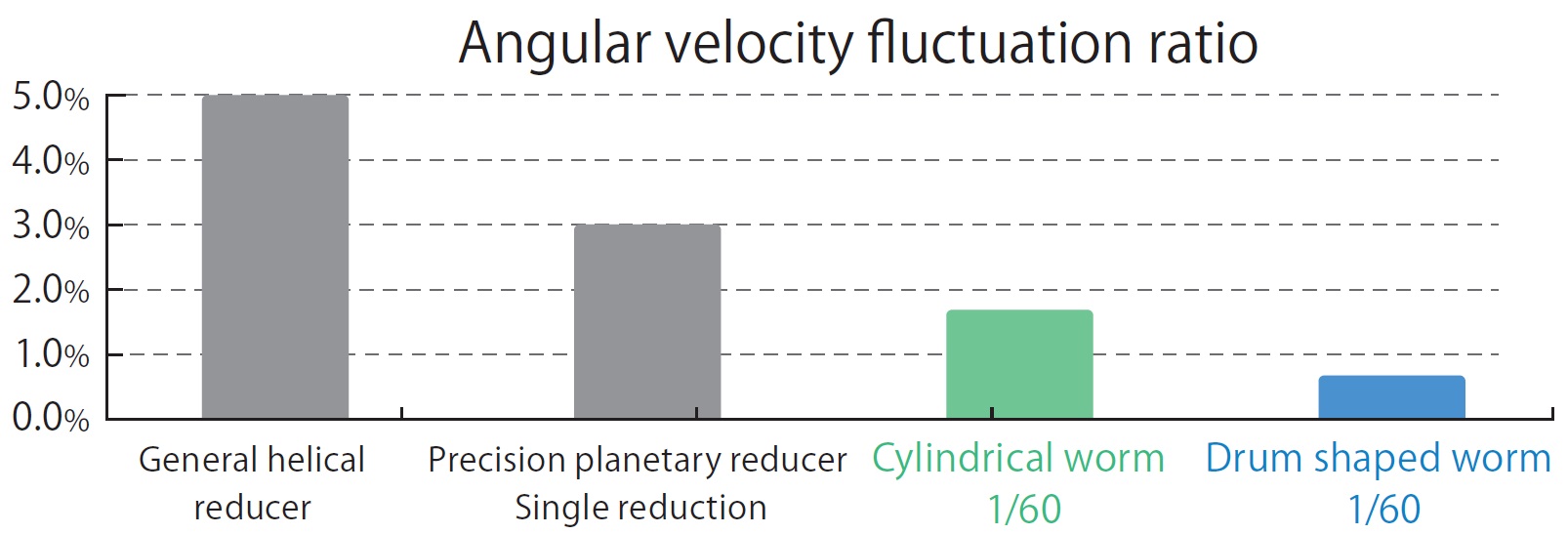 蝸輪驅動(一般蝸輪)的旋轉波動(角速度波動率)比其他齒輪小,一般蝸輪的旋轉波動約為 1% 至 2%。 此外,由於TD 減速機(鼓形蝸輪)同時嚙合的齒數更多,因此其精度甚至比一般蝸輪約為 0.5%。 |