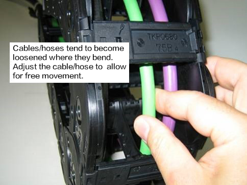 | 4 | 電纜和軟管在電纜保護鏈條內纏繞打結。 |