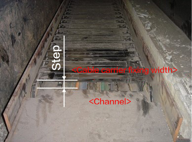 電纜保護鏈條內表面滑動的導軌與電纜保護鏈條固定端連接處的高度差很大。 結果,放大了從導軌連接到固定端鏈節時的滑動電阻。 |